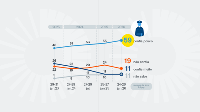 A taxa dos que confiam pouco nas forças de segurança subiu 11 pontos percentuais desde o início de 2023, quando a pergunta começou a ser feita. Só 11% dizem ter plena confiança na atuação da polícia. A taxa caiu 15 pontos percentuais de janeiro de 2023 a janeiro de 2025. Outros 11% não souberam responder.