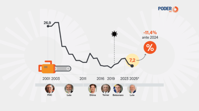 O desmatamento na Amazônia caiu 17,4% em 2025 em relação ao ano de 2024 e atingiu o menor patamar da série histórica, segundo dados do Inpe (Instituto Nacional de Pesquisas Espaciais). Foram desmatados 5.013 km de 1º de janeiro a 19 de dezembro de 2025. A queda foi de 35,8% em relação ao 1º ano do governo de Luiz Inácio Lula da Silva (PT).