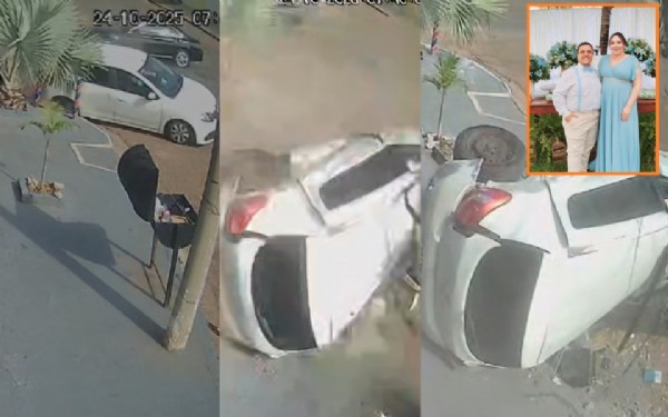 Imagens de uma câmera de segurança obtidas com exclusividade por Olhar Direto capturaram o exato momento que o carro do casal de engenheiros Giovani Vinicius e Priscilla Furoni bate em uma Mercedes e é arremessado contra um poste de energia em frente a uma barbearia do bairro CPA 1, em Cuiabá. O acidente, registrado na manhã desta sexta-feira (24), terminou com a morte dos dois. O carro do casal, um Renault Sandero, ficou completamente destruído.
