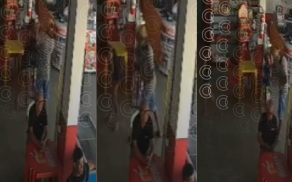 O vídeo ainda mostra o homem andando com a mão em cima da barriga com outros clientes do bar o observando. O registro termina com a mulher indo embora do local.