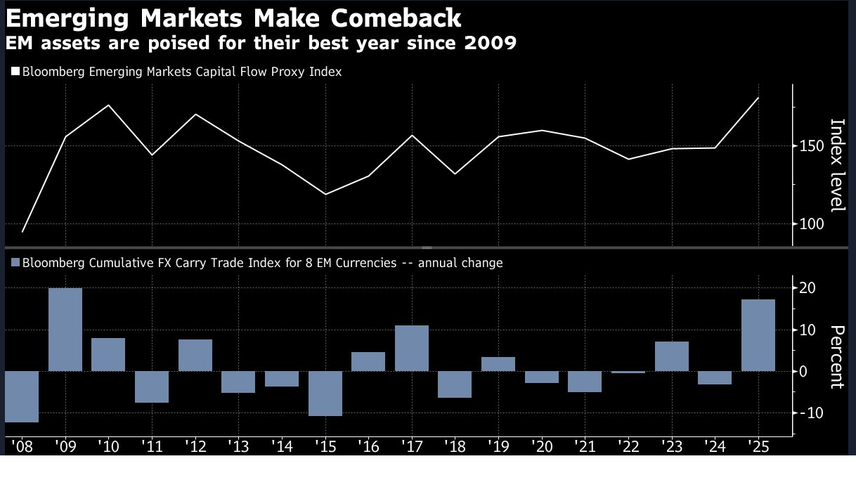 Os mercados emergentes estão preparados para começar 2026 como uma opção preferencial em Wall Street, com gestores de fundos apostando em um ciclo plurianual de entrada de investimentos.