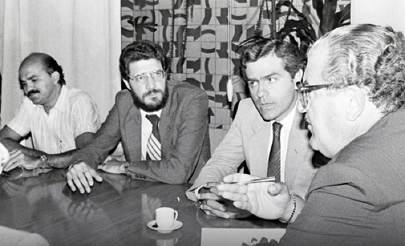 Dante de Oliveira, entre os deputados Airton Soares (PT) e Pimenta da Veiga (PMDB), discute a votação da emenda das Diretas com o presidente da Câmara, Moacyr Dalla (PDS)