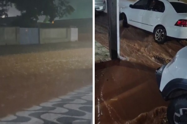 A chuva que caiu na noite deste sábado (18) em Chapada dos Guimarães (65 km de Cuiabá), por volta de 18h40, provocou enxurradas em algumas ruas da cidade. Nas imagens recebidas pela coluna, é possível ver a água escorrendo em alta velocidade pelas vias e chegando próximo de invadir calçadas. O site Climatempo aponta que o tempo continuará fechado neste domingo (19). A previsão é de chuva forte pela manhã e abertura de sol à tarde, com pancadas de chuva que devem se estender até a noite. A temperatura máxima não deve ultrapassar 27ºC.