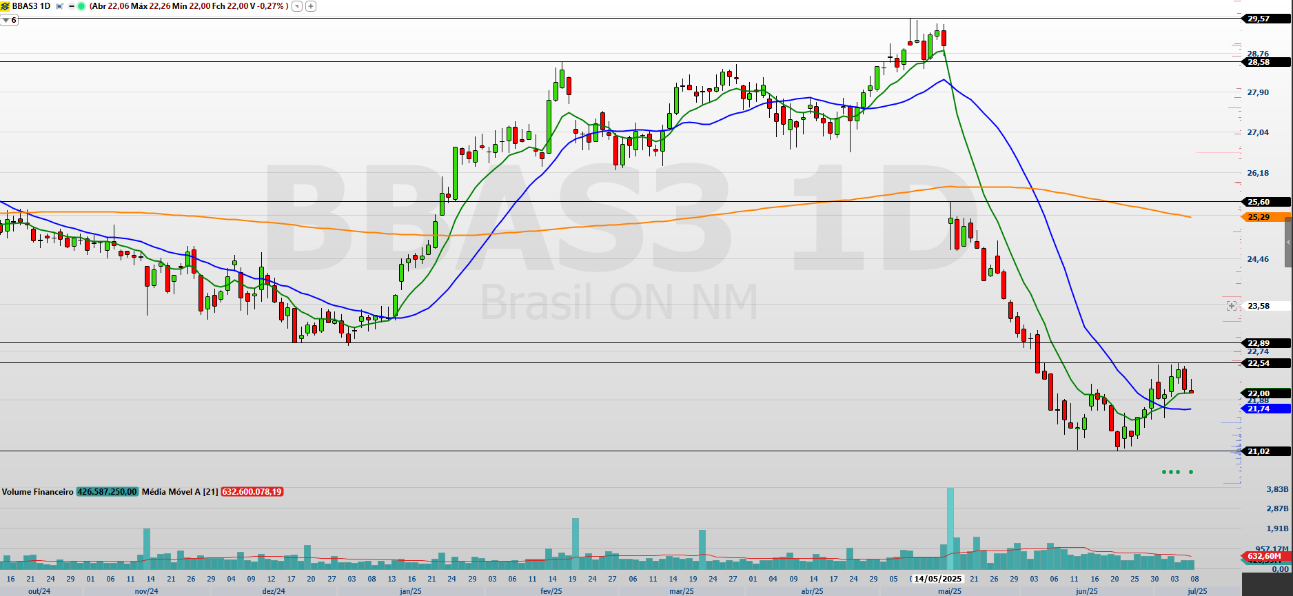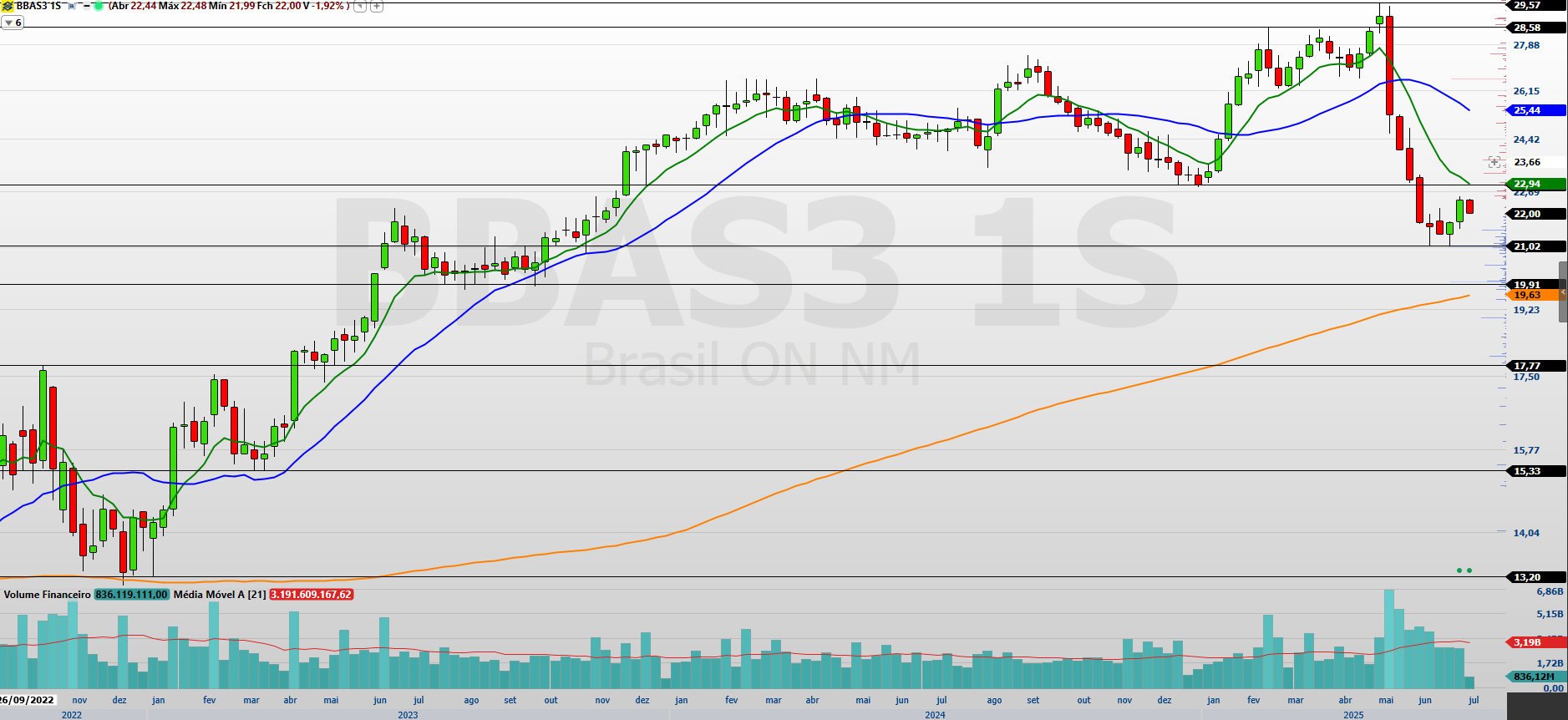 No cenário técnico, BBAS3 opera abaixo de suas médias móveis principais nos gráficos diário e semanal, o que reforça o viés vendedor. No entanto, após tocar a região de R$ 21,00, mínima do ano e suporte chave, o ativo passou a ensaiar um movimento de recuperação, que pode ganhar fôlego caso vença resistências relevantes nas próximas sessões. Ainda assim, a estrutura gráfica no médio prazo segue fragilizada, e uma eventual perda do suporte atual pode abrir espaço para quedas mais acentuadas.