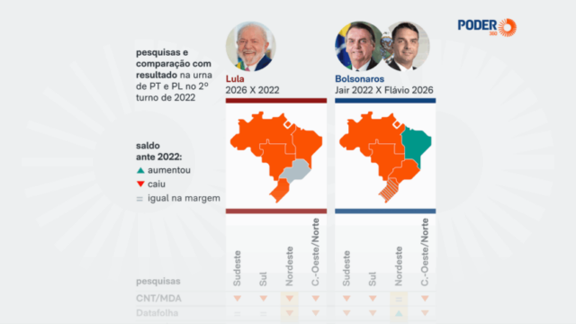 Em 2022, Lula teve 43,4% dos votos totais (considerando brancos e nulos) entre os sudestinos. Agora, as pesquisas indicam que ele tem de 41% a 46% das intenções de voto na região. Não houve uma deterioração como a observada no Nordeste.