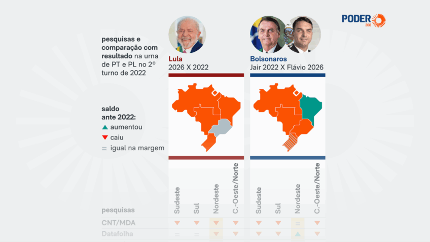 - Norte e Centro-Oeste – as empresas de pesquisa mesclam essas regiões por serem menos populosas. Os números mostram que Lula e Flávio estão aquém dos resultados de 2022. Eis os demais desempenhos.
