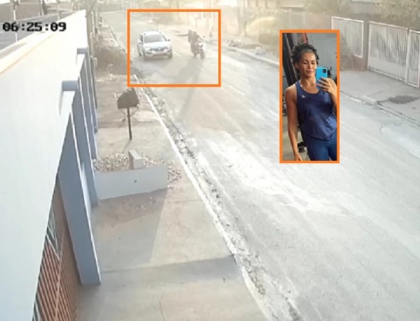 Câmeras de segurança registraram o momento em que dois homens em uma motocicleta atiraram contra a mulher, que estava dentro de seu carro. A dupla ainda não foi localizada.