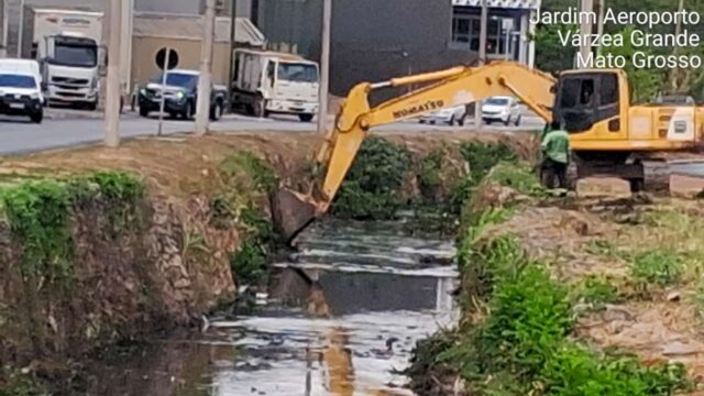 A Prefeitura de Várzea Grande, por meio da Secretaria de Viação e Obras, está executando serviços de limpeza e desobstrução no córrego localizado na região do Aeroporto, nas proximidades do shopping. A ação é preventiva e tem como objetivo ampliar a vazão de água no local, reduzindo riscos de alagamentos durante o período chuvoso.