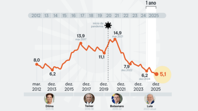 <br /> Taxa de desemprego cai para 5,1% em 2025, a menor da história