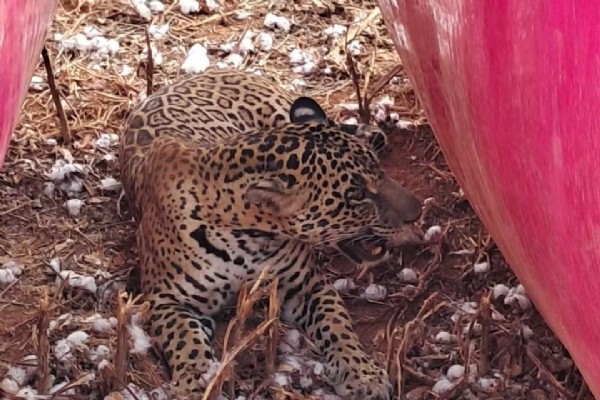 Um filhote de onça-pintada foi flagrado se escondendo do calor sob rolos de algodão em uma fazenda em Nova Ubiratã. As imagens foram registradas no sábado (6) pelo gerente da propriedade, Cirineu Bezerra, 48. Na gravação é possível ver o animal deitado no chão entre dois rolos de algodão. Bezerra informou ao portal g1 Mato Grosso que não se assustou com a cena, pois o flagrante de onças na região é comum. Ele afirmou que essa é a quinta vez que vê um animal no local e que, por isso, manteve a calma, conseguindo filmar o filhote de perto. Nessa época do ano, é comum que as temperaturas passem dos 40ºC.