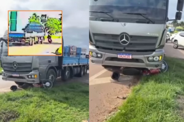 Um vídeo gravado por uma câmera de segurança registrou o momento em que uma motociclista de 23 anos é atropelada por um caminhão na rodovia BR-163, em Sinop (a 480 km de Cuiabá), na manhã de hoje (21). A jovem entrou na frente do veículo, ao tentar acessar um contorno.